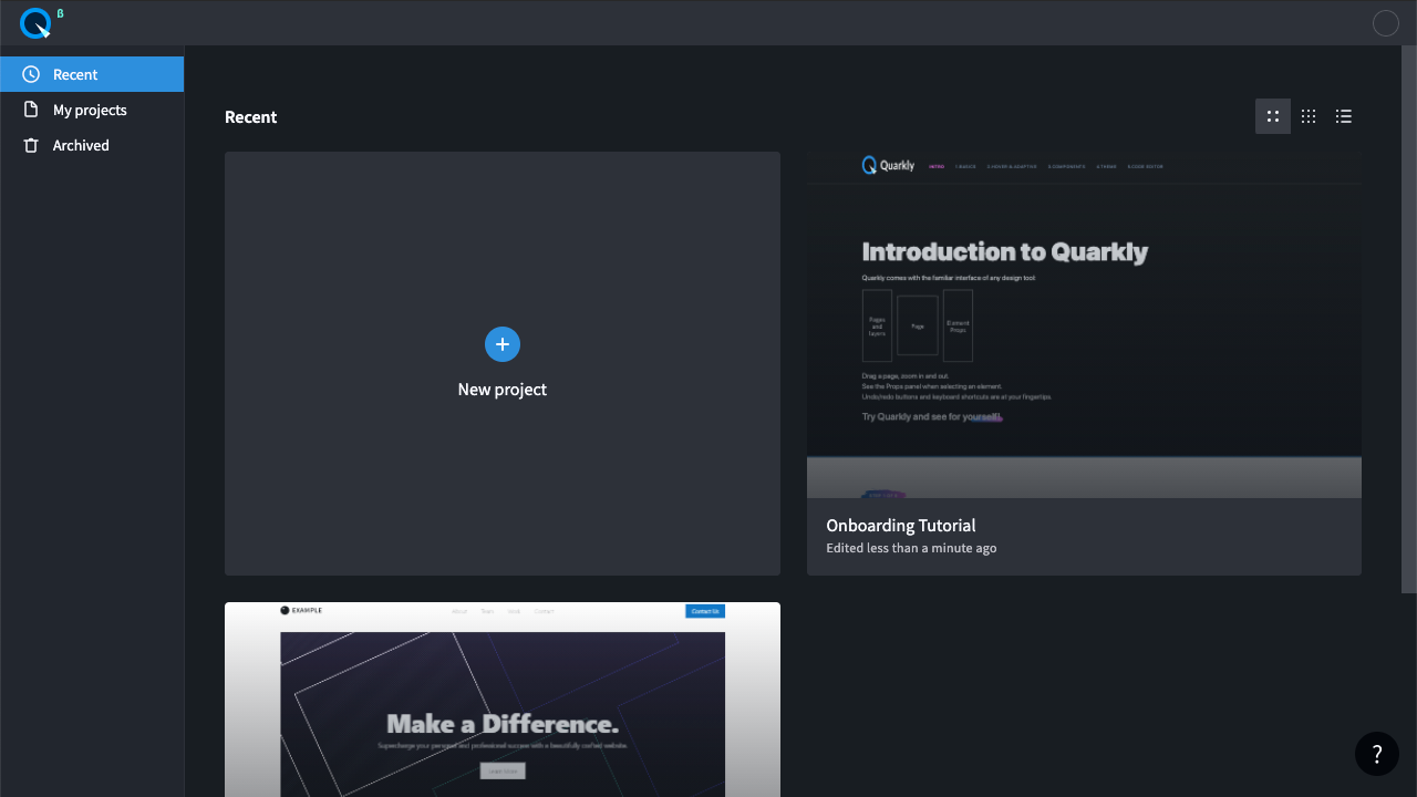 После авторизации вы попадаете в Dashboard. Для вас автоматически создаются 2 проекта: Onboarding Tutorial — который научит основам работы в Quarkly, и Website Example — пример готового сайта.