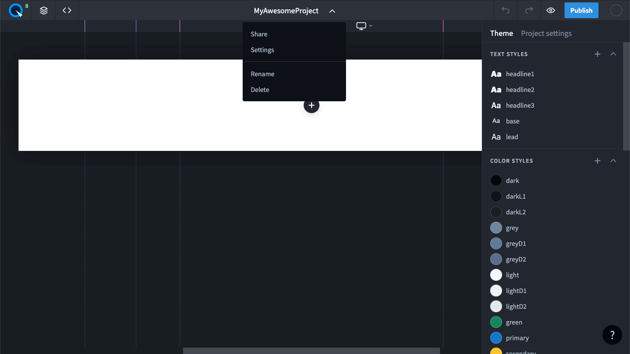 Вы находитесь в интерфейсе визуального редактора. Чтобы переименовать проект или дать доступ к нему другим участникам, откройте меню настроек проекта.