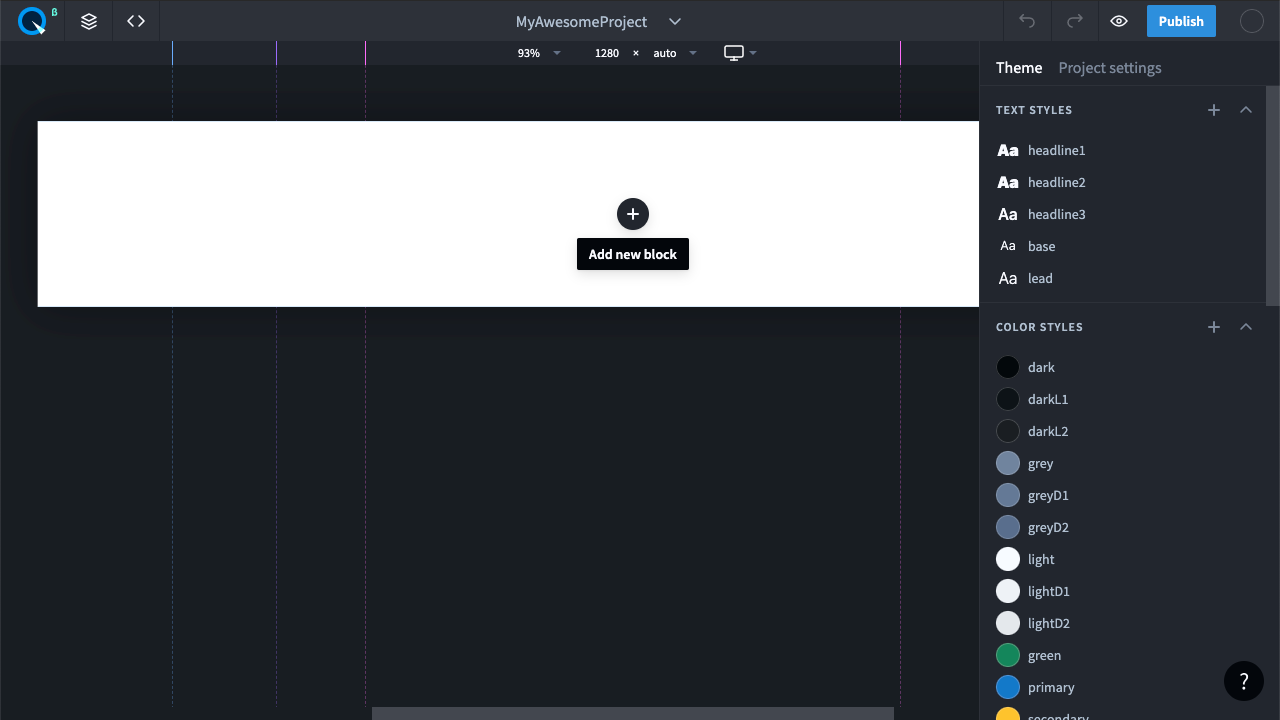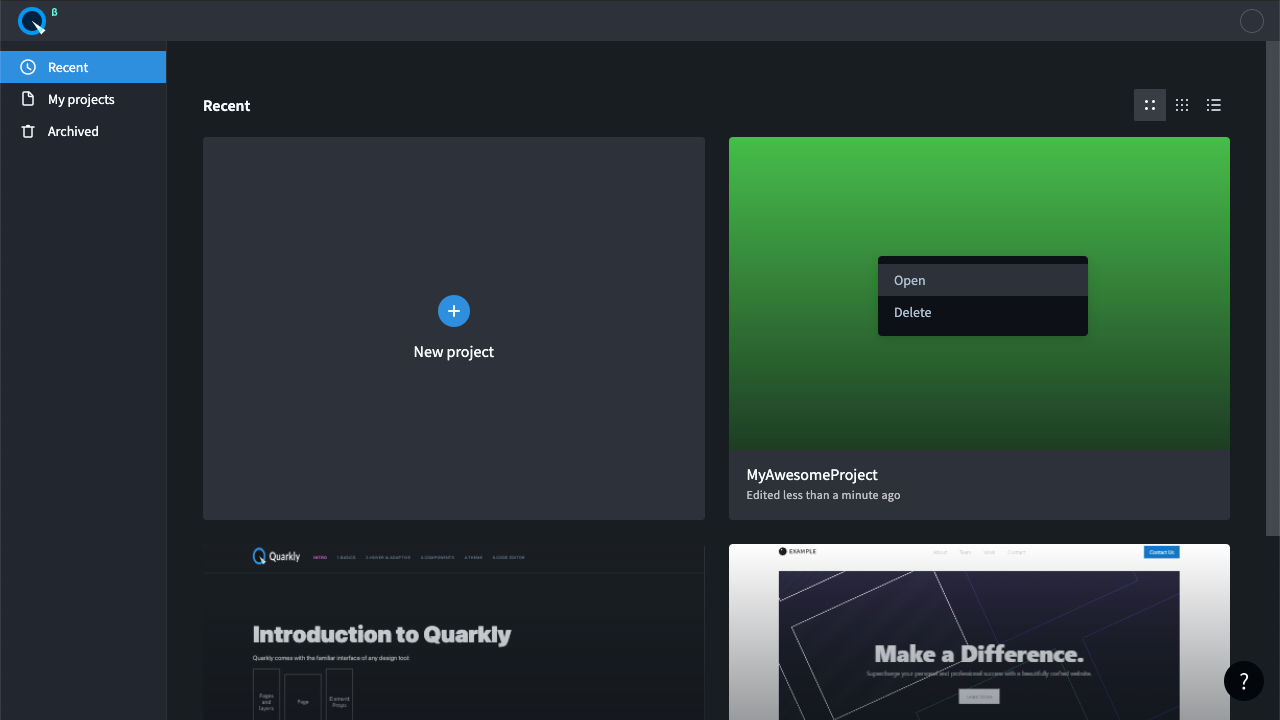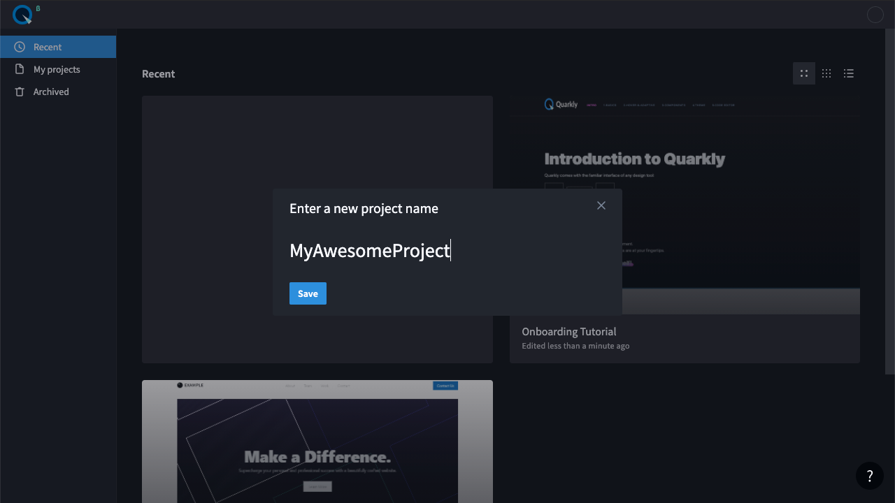 Создайте новый Quarkly проект, для этого нажмите на карточку с кнопкой “+” и введите имя проекта.
