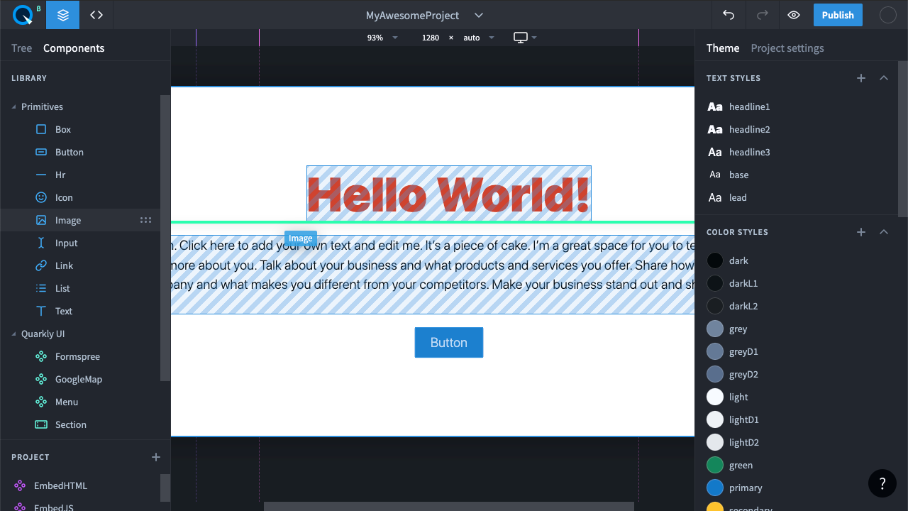 Чтобы добавить элемент, перейдите во вкладку Components. Здесь есть как примитивные компоненты так и сложные. Ещё здесь можно создавать свои компоненты.