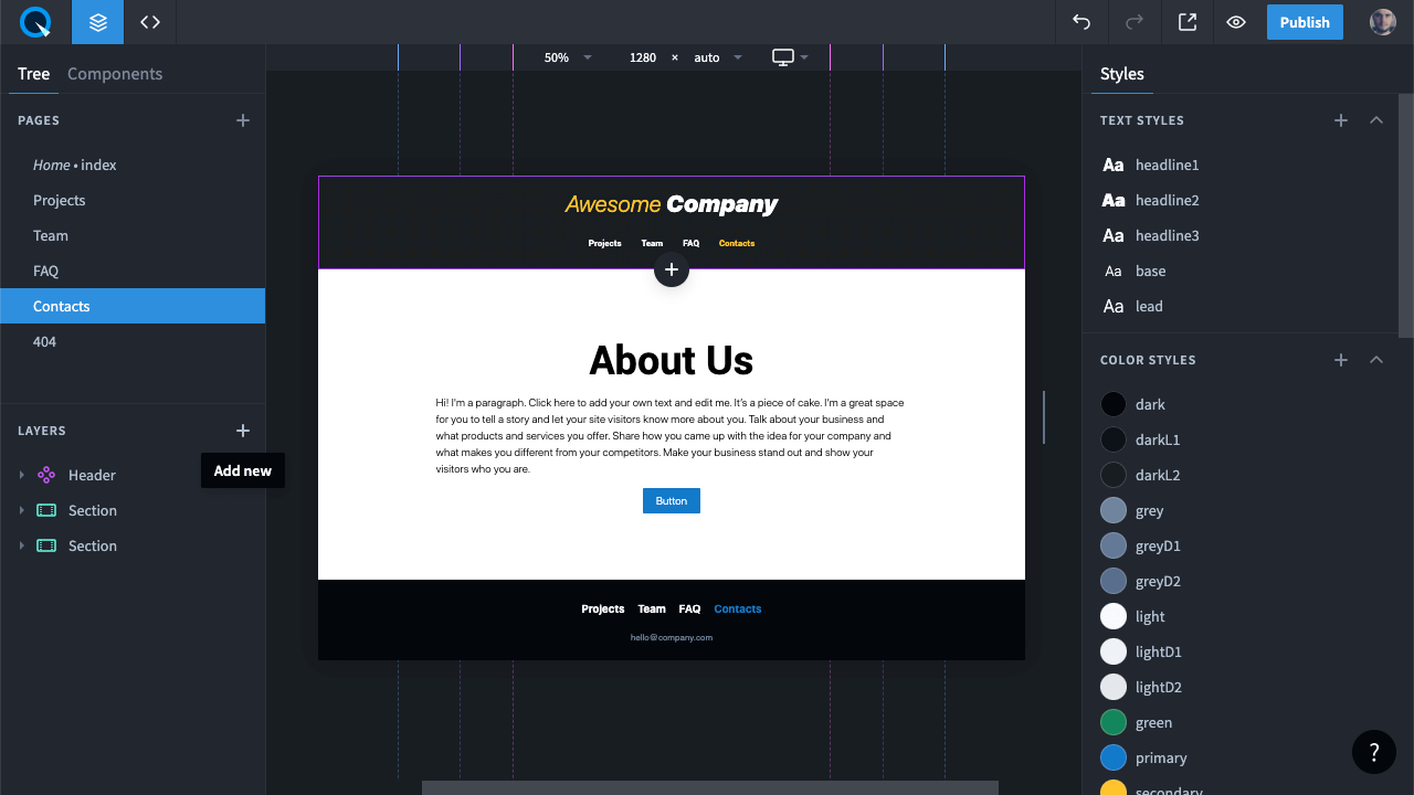 This is where you'll find all the available components. They make it easier and faster to create a website design as they contain ready-to-use styles, content, and logic. In addition, components can be nested within other components.