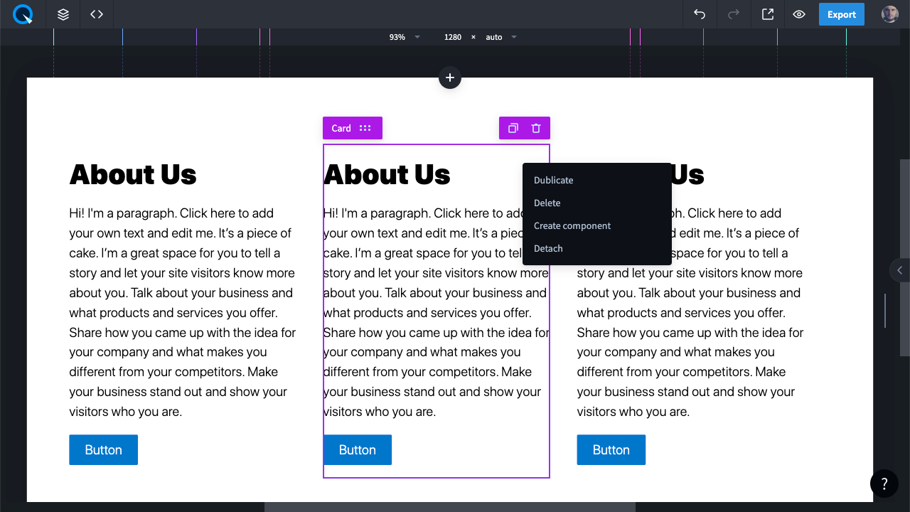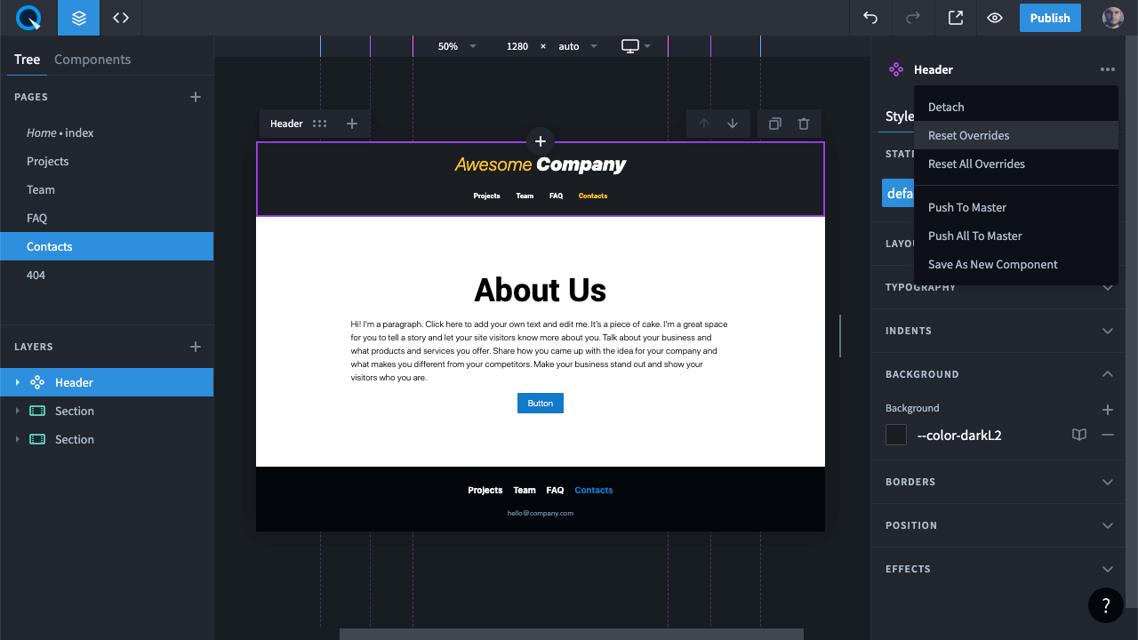 Custom components are needed when you would like to create your own component from elements on the page or configure it in the code. Components created from page elements come with an interesting option — if you change one copy of this component, you can also change other copies accordingly using the “Push to Master” command. Custom components, just like the other, have the props panel with style and functional properties. Inner properties of custom components can be transferred to the props panel and, will appear under the “Props” section. In custom components, it’s also possible to import other components and modules from