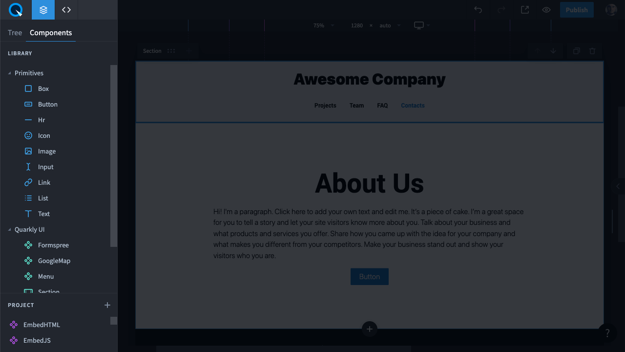 To ensure flexibility, components come with props (properties) — through them, you can manage and configure settings. For example, the GoogleMap component contains the “query” property where you can enter the address of the marker that you’d like to appear on the map. A component may have various props, and they’re all very easy to use.