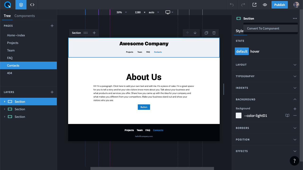 Choose any element (just one, but it can contain others) on a page, click “...” on the props panel and choose “Convert to Component”. In addition, a component can be created with a combination of keys: cmd(ctrl) + alt + k. After that, a window for entering a component name will appear. Type in a unique name and click “Save”.