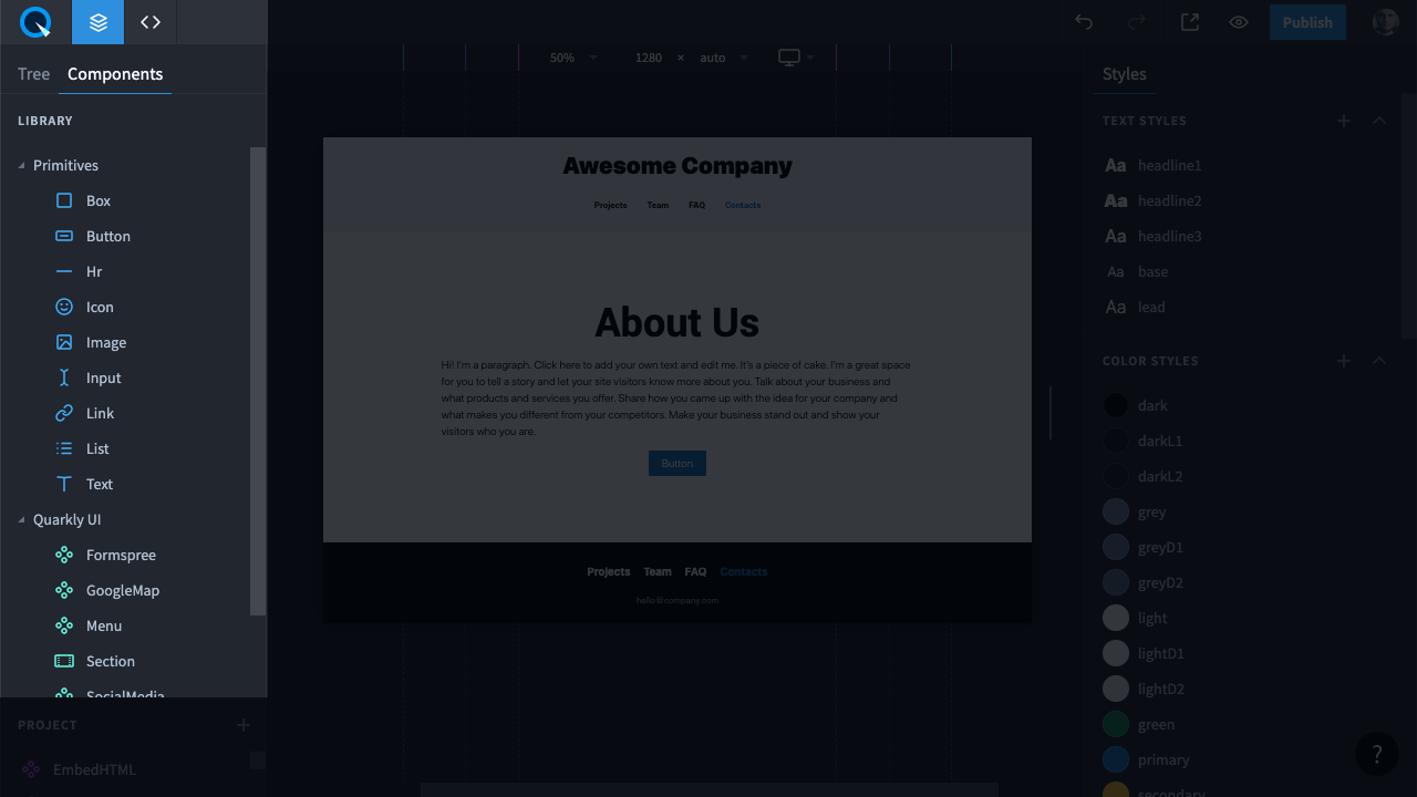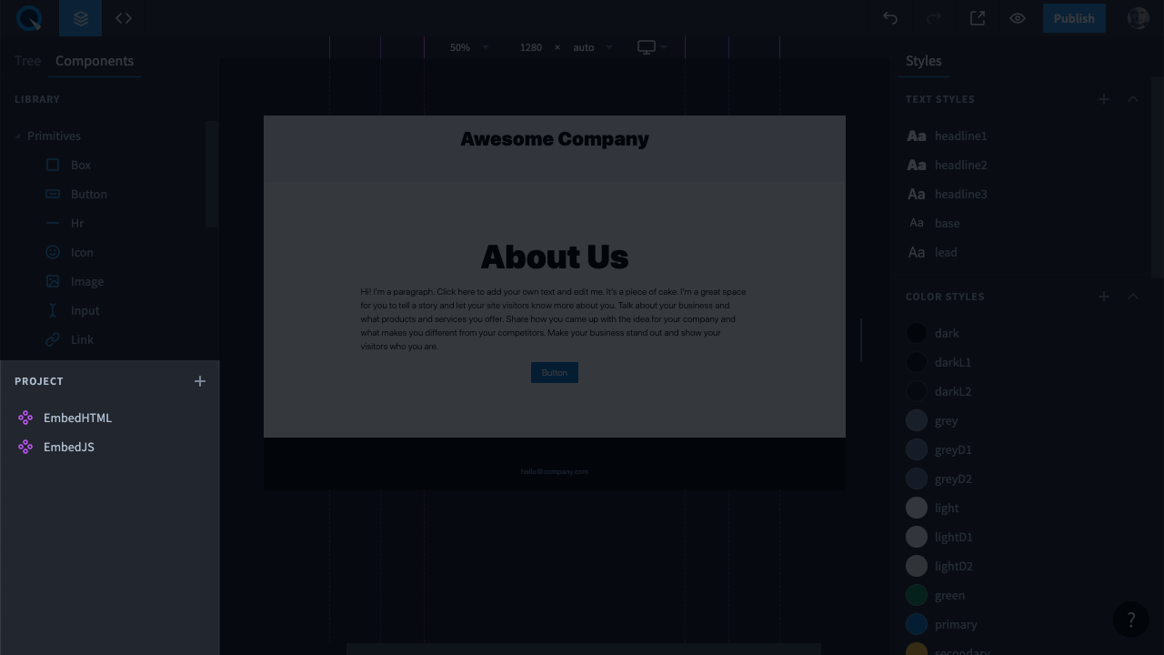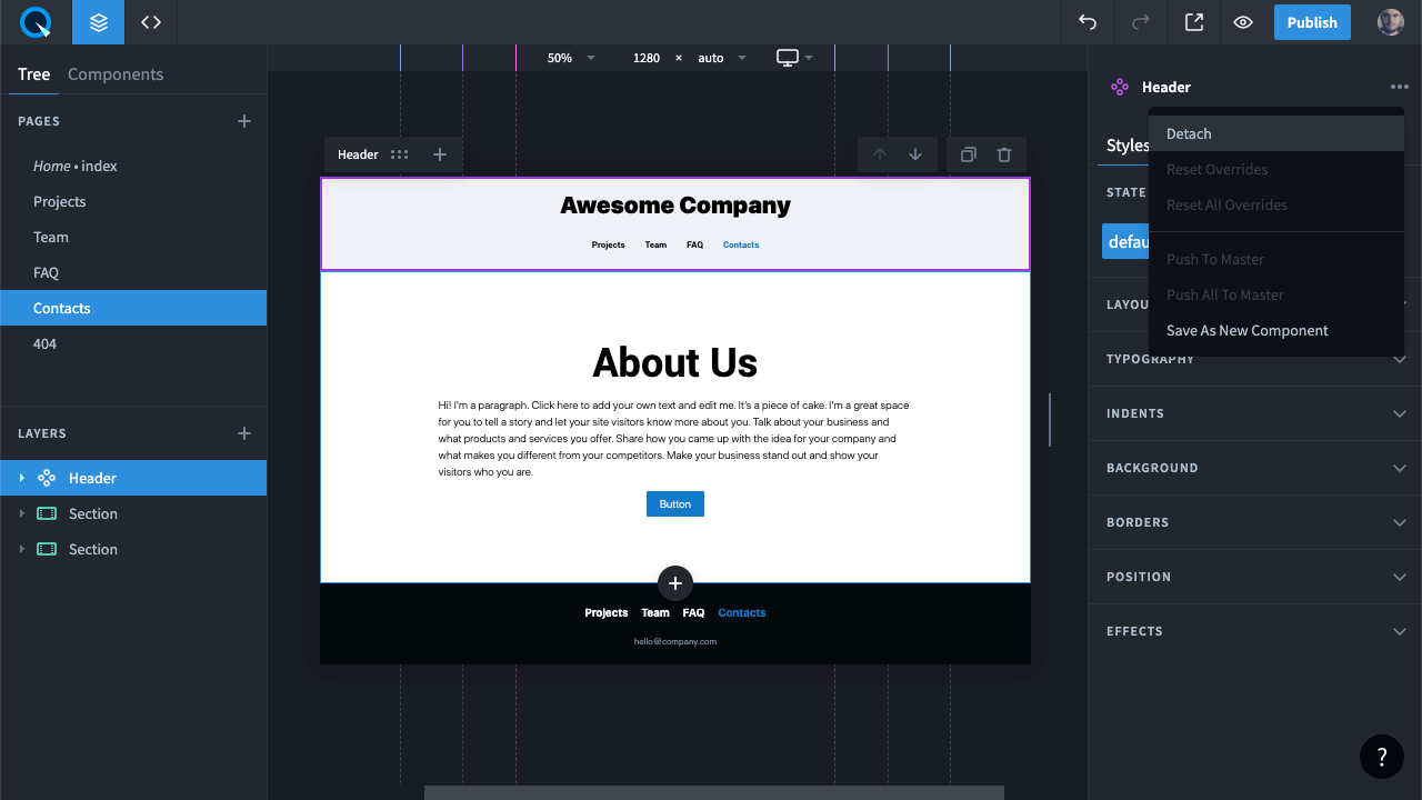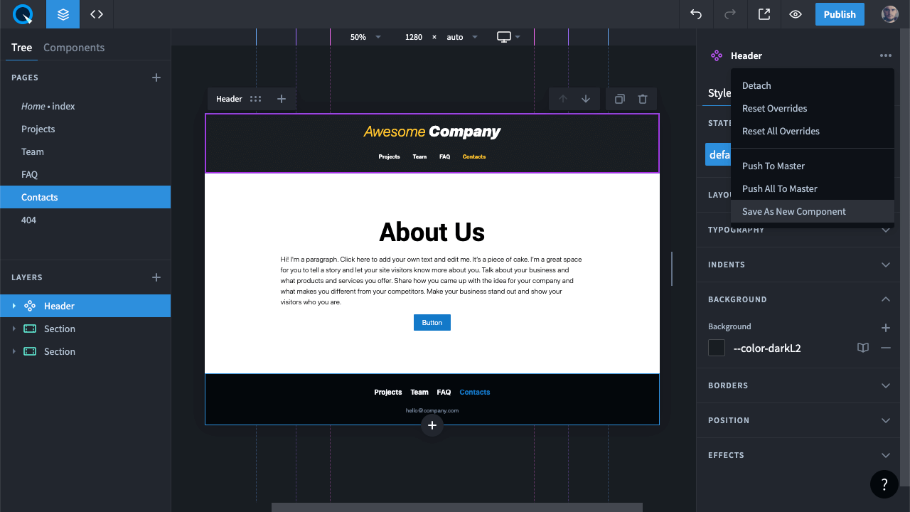 Custom components are needed when you would like to create your own component from elements on the page or configure it in the code. Components created from page elements come with an interesting option — if you change one copy of this component, you can also change other copies accordingly using the “Push to Master” command. Custom components, just like the other, have the props panel with style and functional properties. Inner properties of custom components can be transferred to the props panel and, will appear under the “Props” section. In custom components, it’s also possible to import other components and modules from