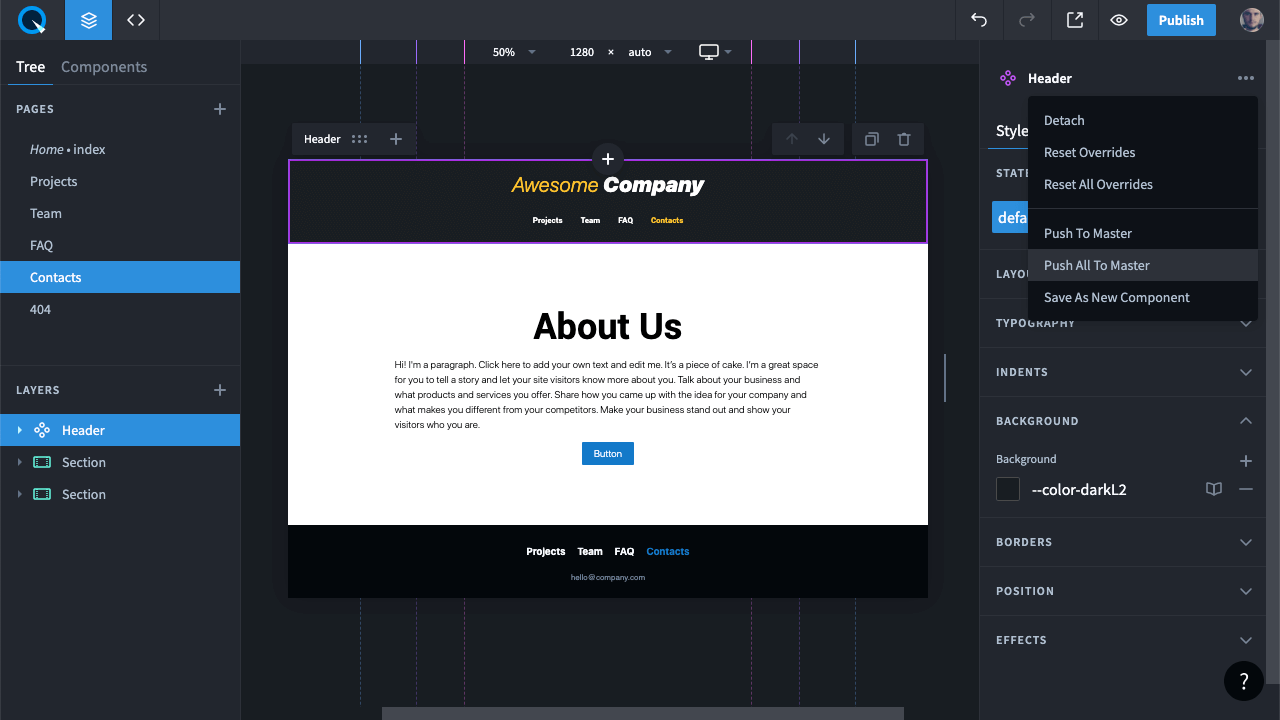 If you changed a custom component and would like to apply the change to all copies of this component, use the command for sending changes to Master. To do this, choose only one component, click on the “...” on the props panel and choose “Push to Master”. If you want to send the changes of a parent element and all children elements to Master, click “Push All to Master”.