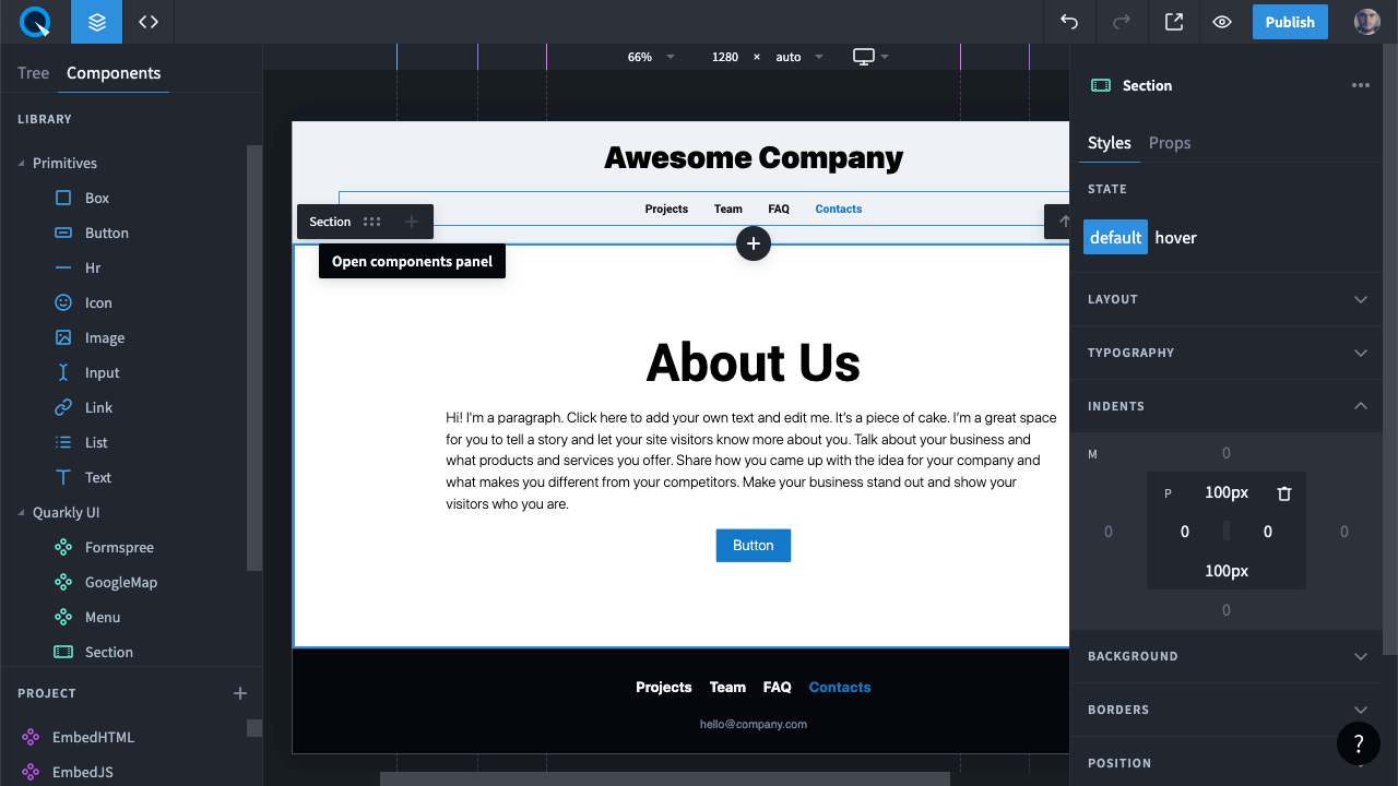 To ensure flexibility, components come with props (properties) — through them, you can manage and configure settings. For example, the GoogleMap component contains the “query” property where you can enter the address of the marker that you’d like to appear on the map. A component may have various props, and they’re all very easy to use.