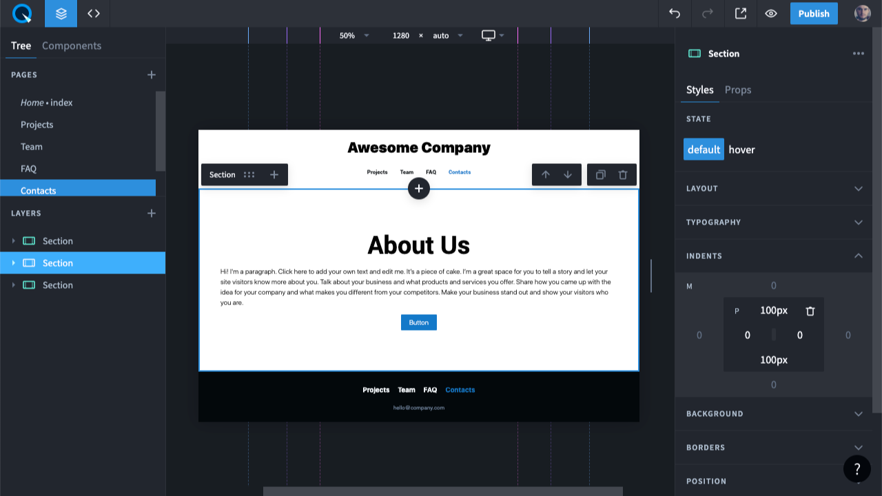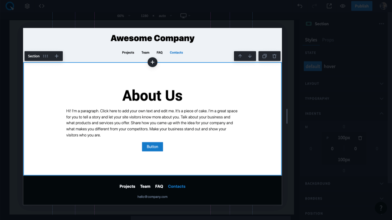 Once an element is selected, the Props panel (on the right) and Button bar (on the page) will appear. In addition, you can manage elements in the Tree tab. You can perform the following actions to the elements on the page and layers panel: