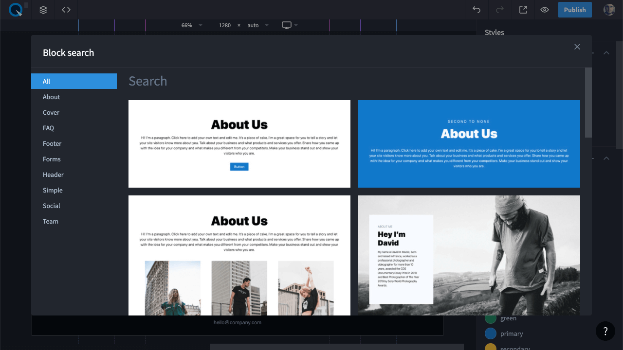 To add a new block to the page, click on the “+” icon. Blocks are grouped by category.