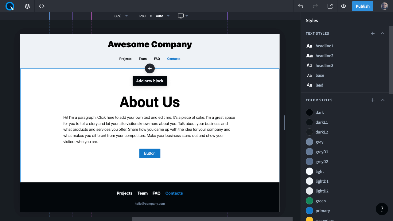 Once a block is selected, the Props panel (on the right) and Button bar (on the page) will appear. You can perform the following actions to the blocks: