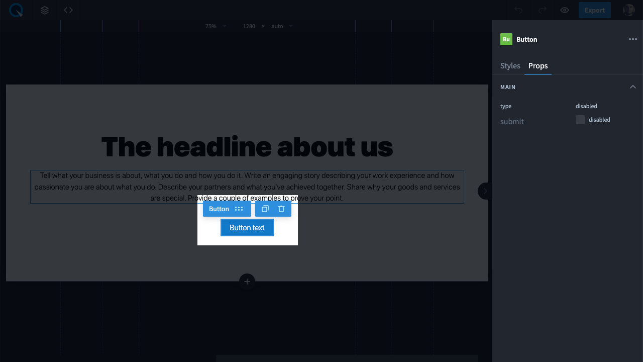 Once the element is selected, its props panel will appear on the right. There, you will see: