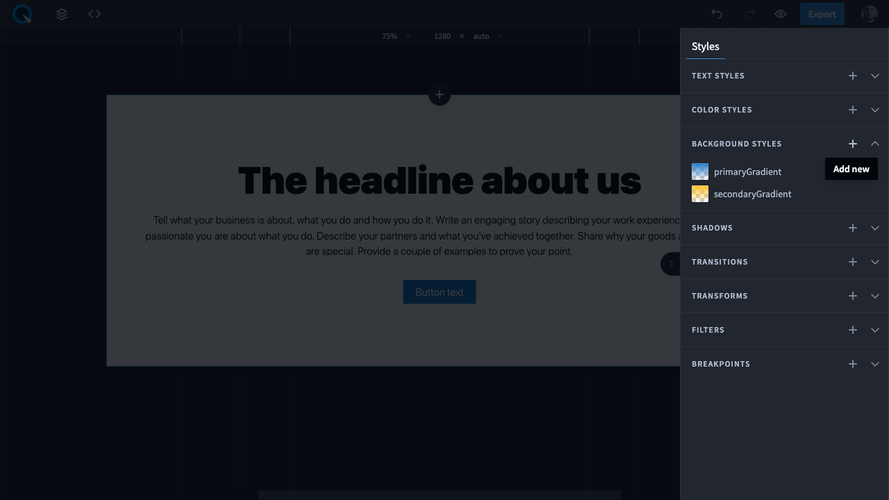 To add a background style to the theme, click on the “+” icon next to the category.